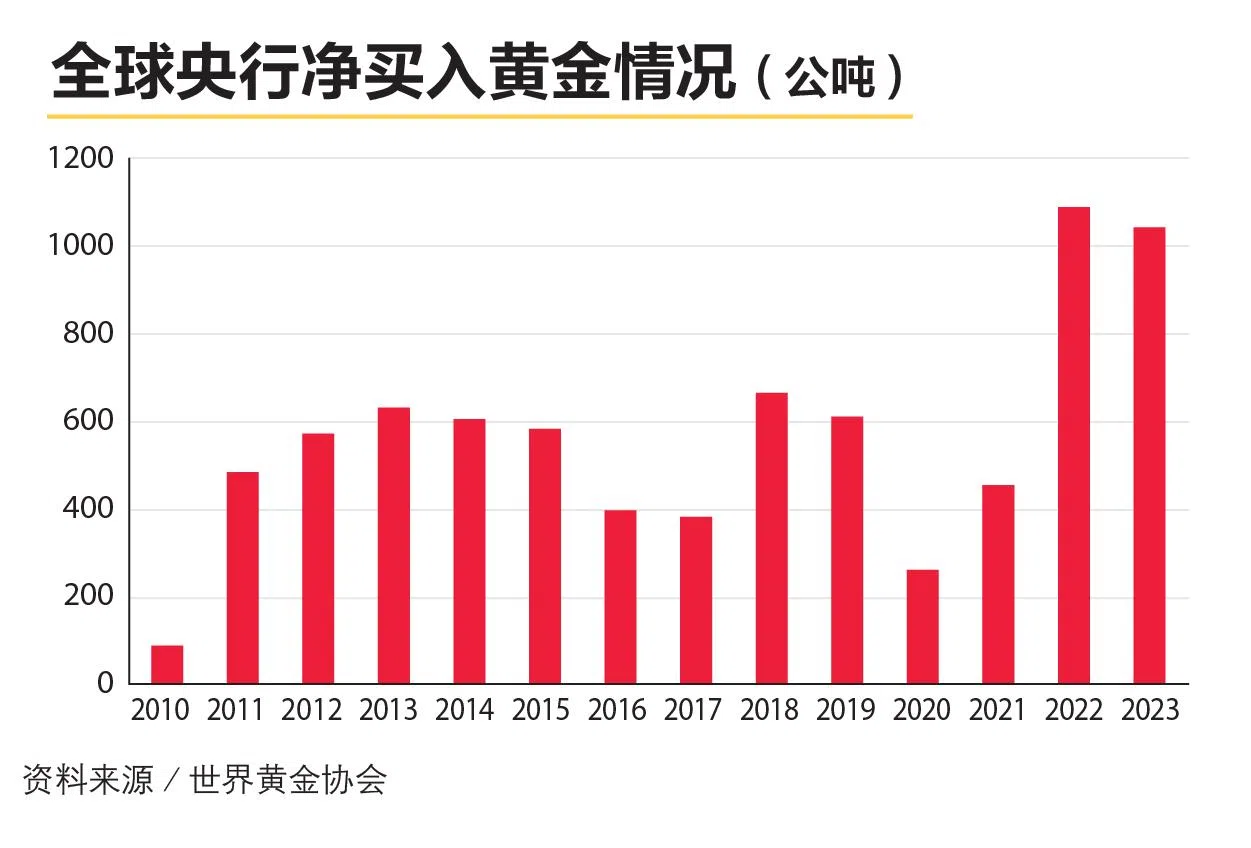 全球央行继续加大黄金储备,去年净买入1037公吨黄金,略低于2022年历史高峰的1081公吨。