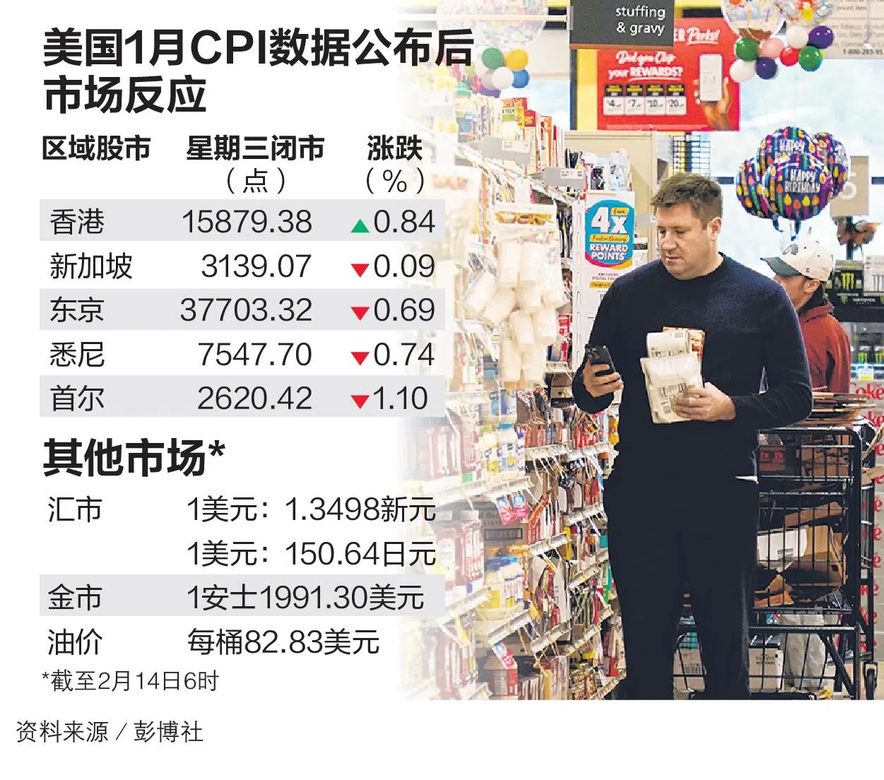 受美国通胀数据影响,星期三新加坡和香港股市开盘分别大跌1.19%和1.64%,但收盘时,新加坡基本平收,只微跌0.09%,香港则由跌转涨,上升0.84%。此外,东京、首尔和悉尼股市收盘时,跌幅也较上午有所收窄。