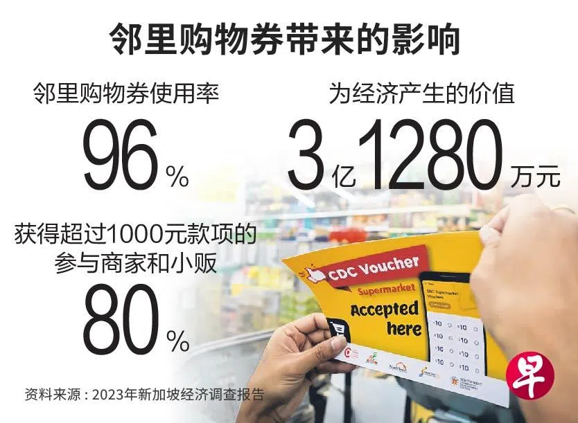 研究显示,符合资格的122万户公民住户当中,有超过96%领取了分别在2021年12月和2022年5月发放的两批邻里购物券。这两年,每户可领取到的邻里购物券总值200元。已领取的购物券当中,96%已使用,总消费金额达2亿2800万元。