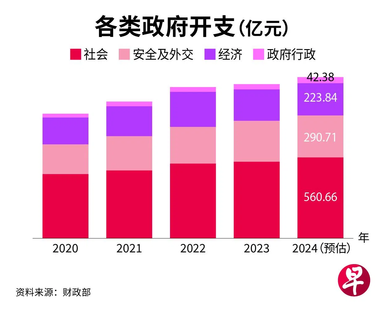 社会支出持续增加,2024年的数额预计达560亿6600万元,较2023年增加29.9亿元(约5.6%),是占比最大的年度支出,占我国国内生产总值的7.8%。