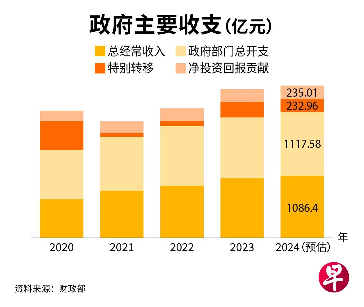 2024财年的政府总经常收入预计达1086亿元,占我国国内生产总值的15.1%,比上个财年的总收入(经修订)多出43亿元。财政部指出,这主要是因为消费税、资产税、个人所得税和汽车税的税收预计提高。这是政府总经常收入连续四年增加。