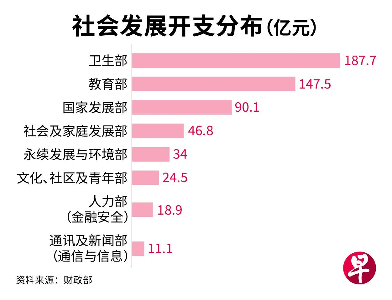 社会支出当中,卫生部的支出占比最大。2024财年,卫生部总开支预计达187.7亿元,比上个财年增加8亿元。这主要是因为三巴旺和淡滨尼北综合诊疗所等新设施启用、新兀兰医疗园(Woodlands Health)扩大容量,以及长期护理领域预计扩大容量。