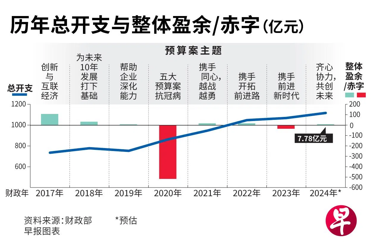 我国2024财政年整体财政预计取得约8亿元的小幅盈余,相等于GDP的0.1%。若不包括国家储备净投资回报贡献、特别转移金额,以及国家重大建设资本总额与利息成本和贷款费用,新财政年将取得基本预算赤字(primary deficit)31亿2000万元。