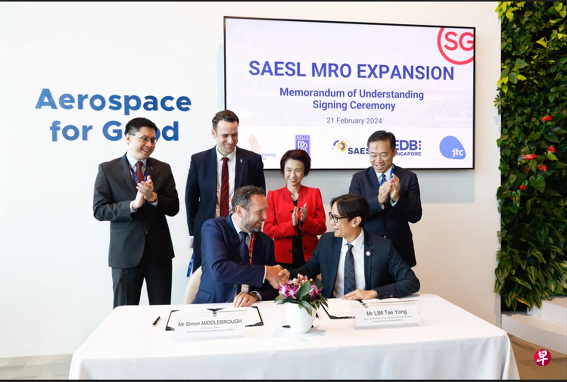 在新加坡航空展上,SAESL星期三与新加坡经济发展局和裕廊集团签署合作谅解备忘录,各方参与讨论以促进SAESL扩展在本地的航空航天制造和保养、维修与翻修(Maintenance,Repair,Overhaul,简称MRO)业务。