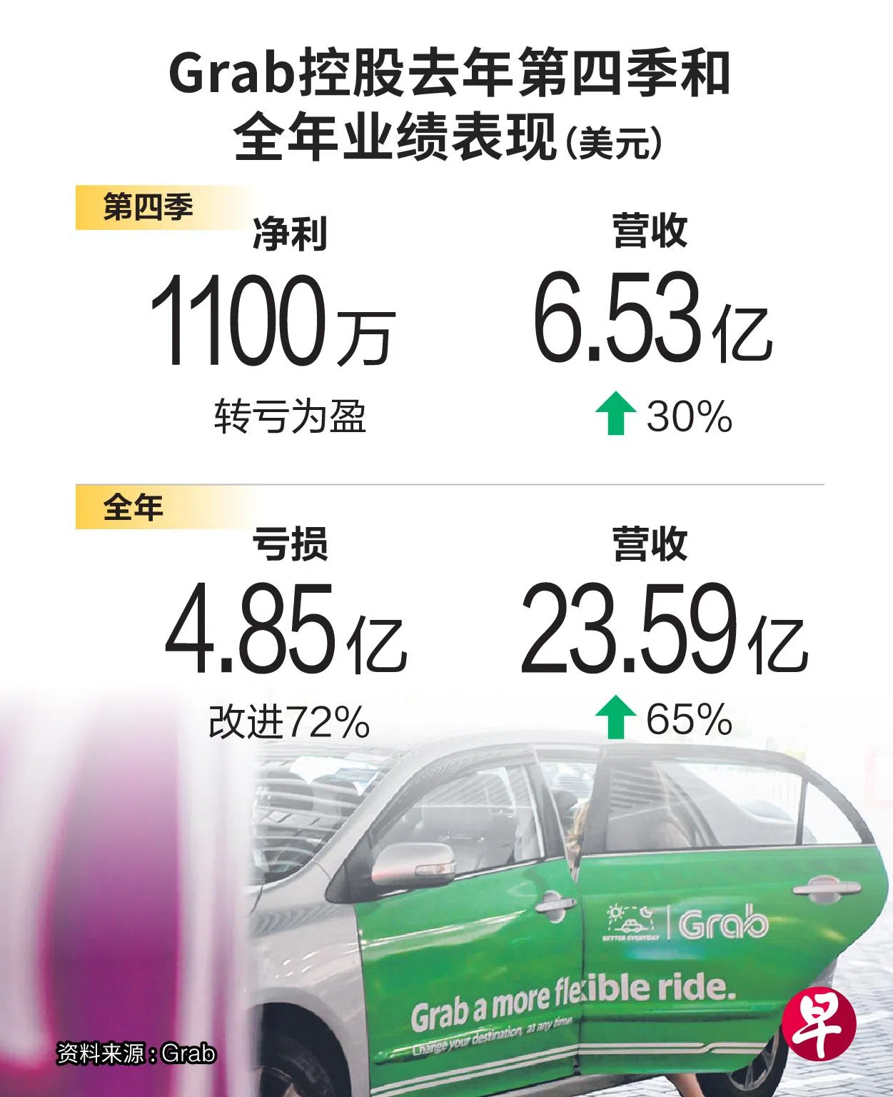 美国上市的本地私召车应用与送餐服务公司Grab控股(Grab Holdings)去年第四季转亏为盈,取得1100万美元(约1475万新元)净利,优于前一季亏损9900万美元和前年同期亏损3亿9100万美元。