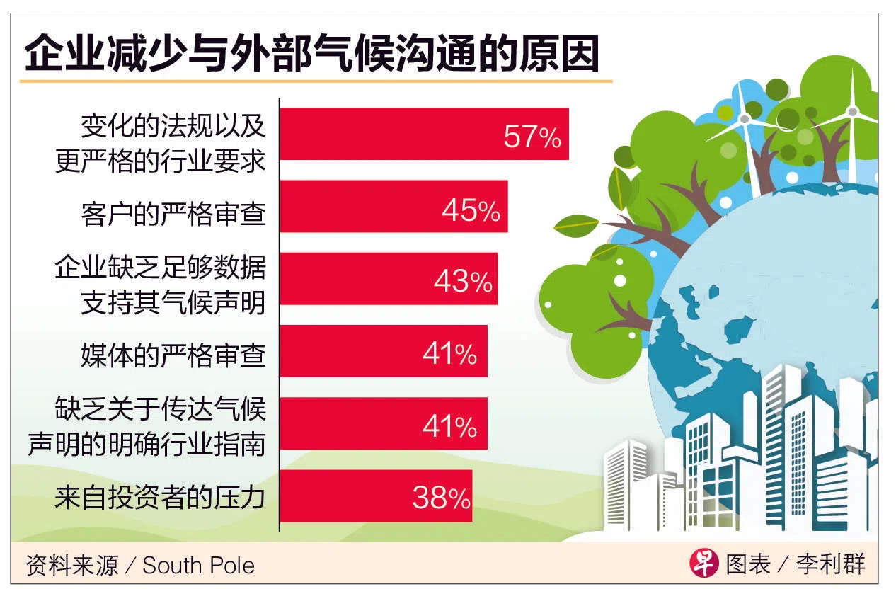 促使这些公司减少对外气候沟通的最重要原因,包括变化的法规及更高的行业要求(57%)、增加的客户审查(45%),以及缺乏足够数据支持其声明(43%)。