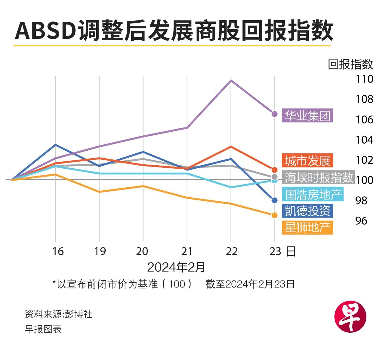 自上周五政府宣布调整ABSD支付率以来,过去一周的主要发展商股中,华业集团上涨了6.6%,本周五(2月23日)闭市价报6.34元。城市发展也上升1%至6.04元。它们的股价表现都优于海峡时报指数。