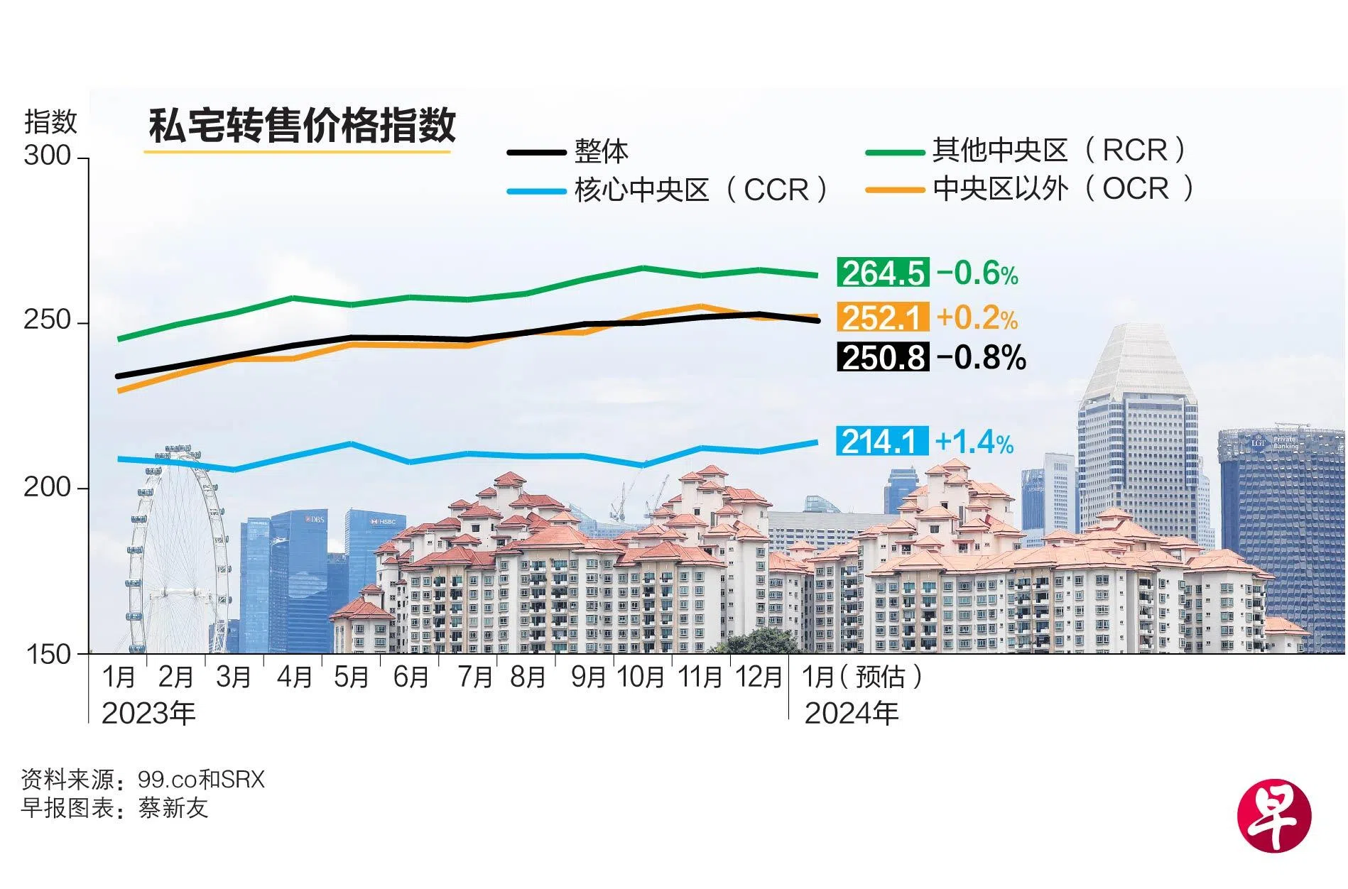 以地区分布来看,1月份除了其他中央区(RCR)的中档私宅转售价下跌0.6%以外,核心中央区(CCR)的高档私宅和中央区以外(OCR)的大众化私宅,转售价分别上扬1.4%和0.2%。