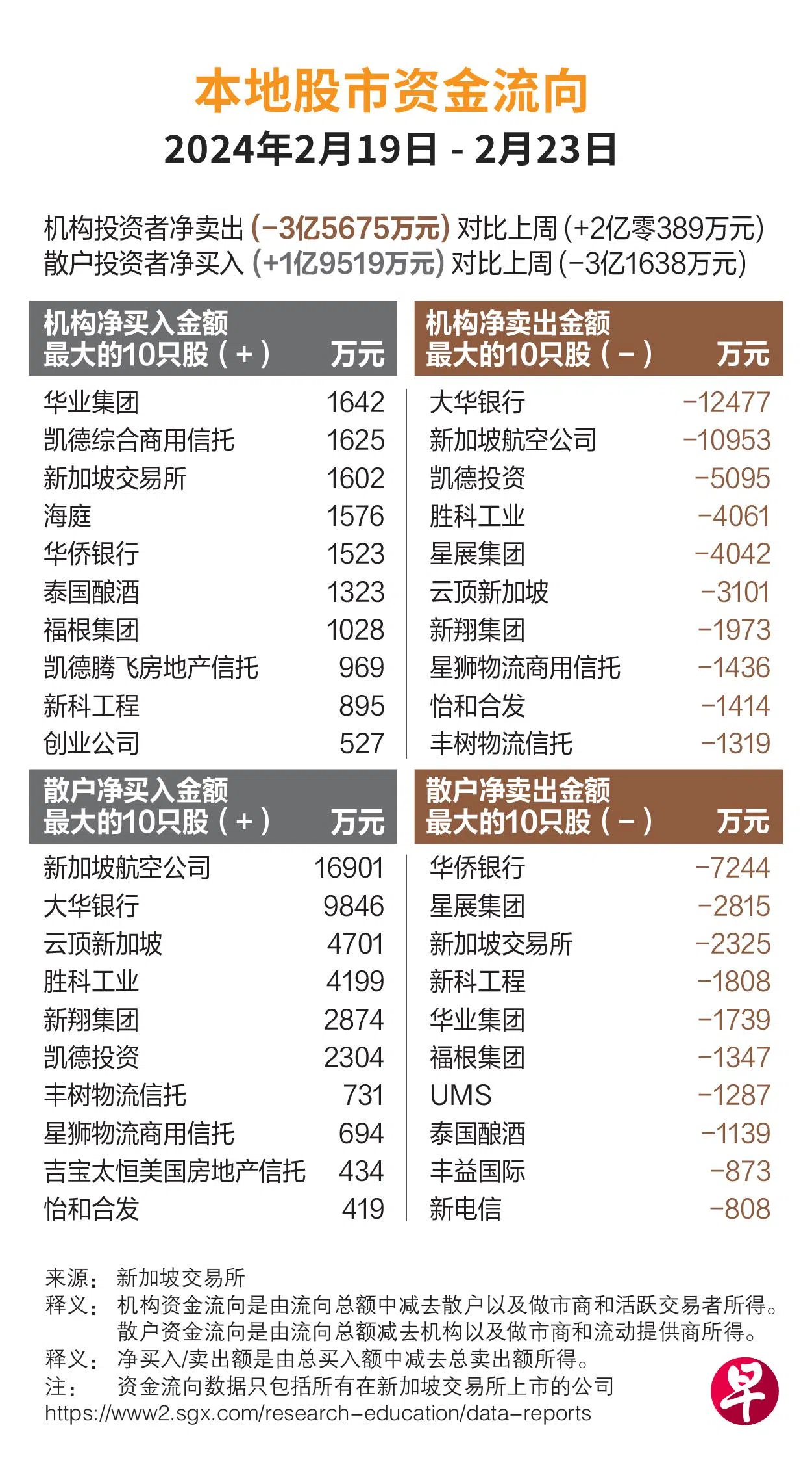 跌幅最大的是华业集团(UOL)和海庭(Seatrium),分别下滑3.63%和2.15%,收报6.11元和0.091元。
