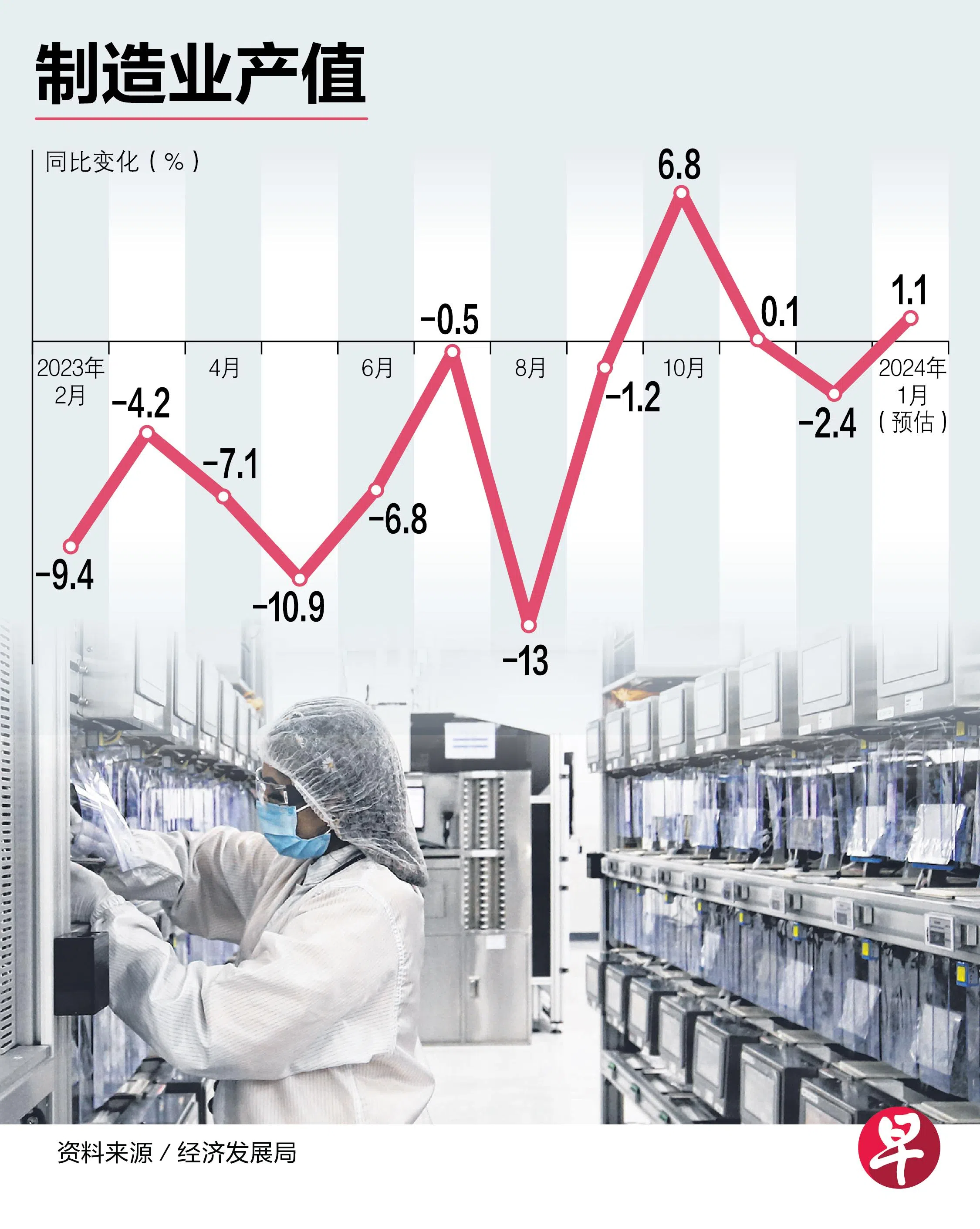 我国制造业产值在今年1月份同比增长1.1%,扭转去年12月的下跌2.4%,但仍低于市场的预期。