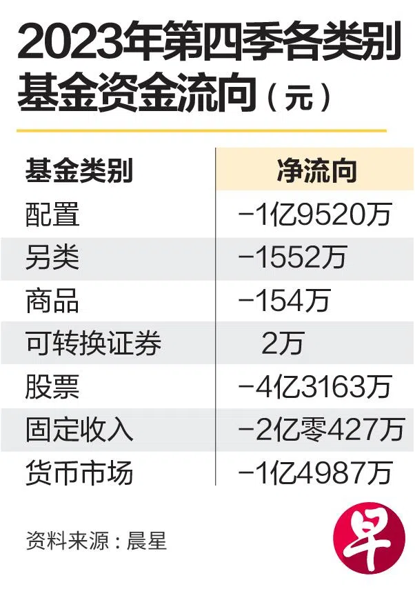 投资研究及基金评级机构晨星(Morningstar)星期五(3月1日)发布的2023年第四季单位信托基金流向报告显示,除了可转换证券(convertibles)基金取得2万元的净流入资金以外,其他各类别资产基金都出现了资金净流出,总的来说,去年第四季各基金的净赎回额达9亿9800万元。