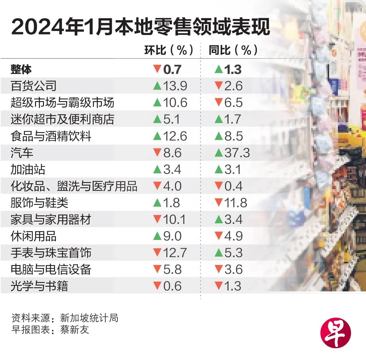 新加坡统计局星期二(3月5日)发布最新的零售销售指数显示,我国今年1月的零售销售额达到43亿元。其中,网上销售占了11.2%,比去年12月的12.8%低。经季节性调整后,1月份的整体零售销售环比下跌0.7%,不包括汽车的销售则上升0.5%。