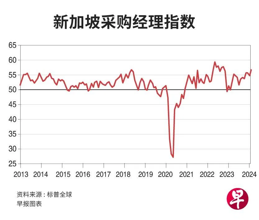 根据标普全球(S&P Global)星期二(3月5日)发布的最新调查报告,经季节性调整后的2月份新加坡采购经理指数(PMI)是56.8,也是本地私人领域的营商环境连续12个月改善,更是自2022年10月以来取得最快速增长的月份。 今年1月的指数是54.7。