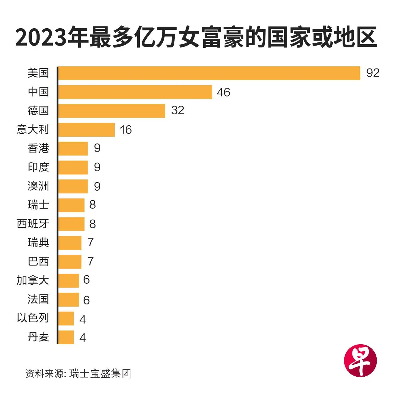 美国和中国是超级女富豪的主要来源地,两国拥有最多高超净值人士和女性亿万富豪,去年两国的亿万富豪人数总和占全球亿万富豪人数超过一半。