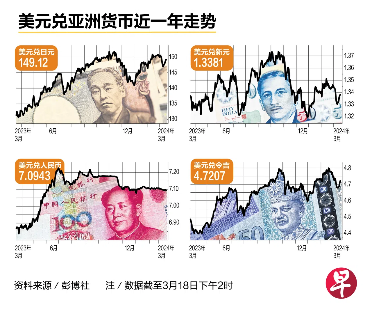 市场普遍预计美国联邦储备局本周召开的议息会议中会继续按兵不动,近期美元兑亚洲各国货币走势应相对平稳。但因今年降息预期不变以及亚洲经济逐步回暖,亚洲货币有望回升。