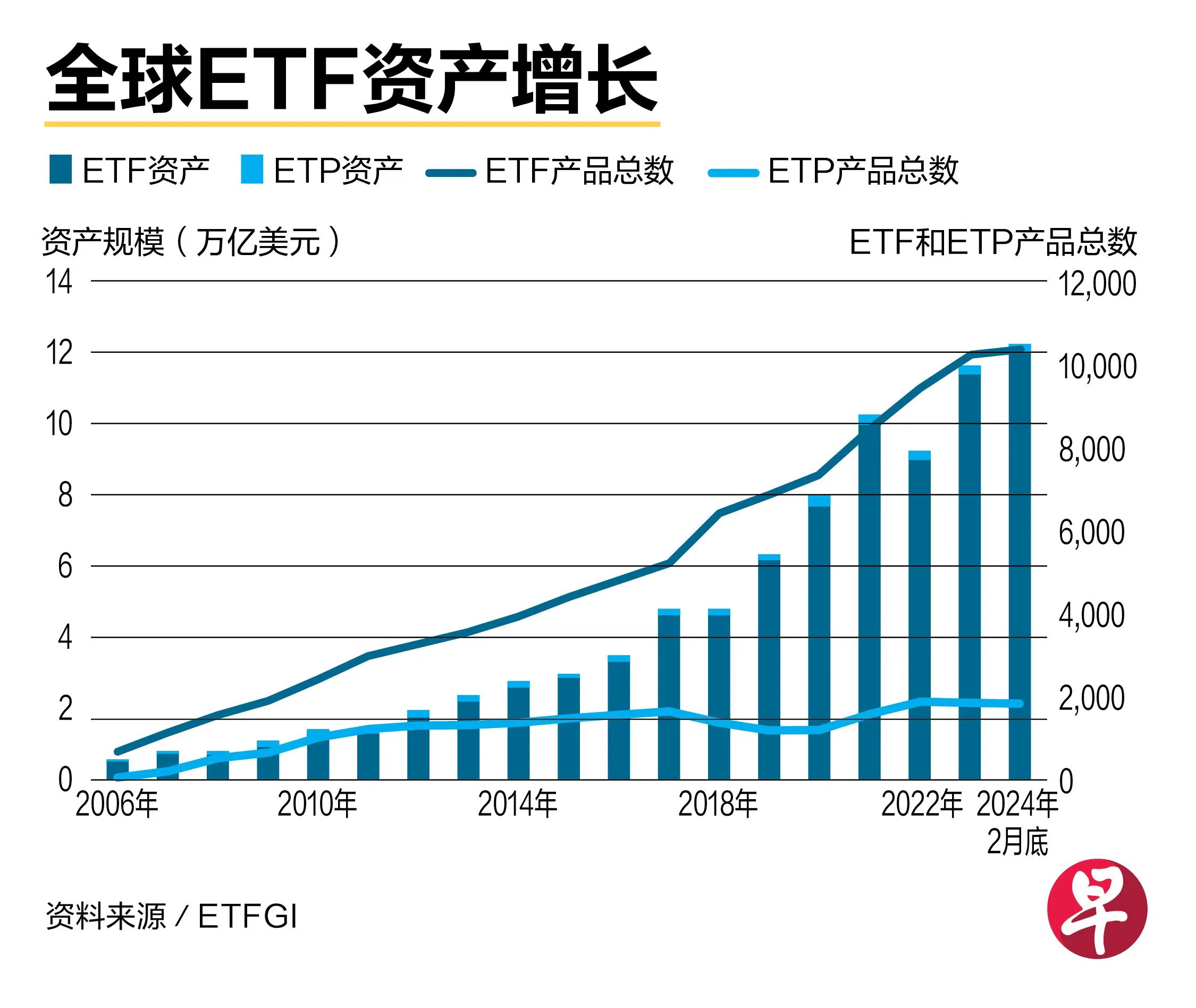 截至今年2月底,全球有1万2063个ETF产品,2万4216只ETF在交易所上市,资产规模为12.25万亿美元。