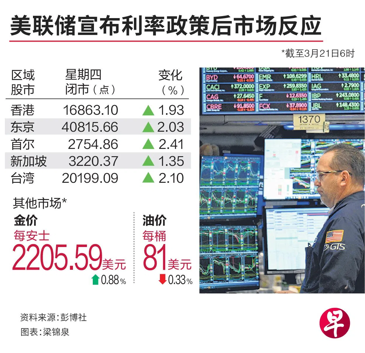 与此同时,黄金价格再创新高,星期四(3月21日)首次冲破每安士2200美元的高点,截至晚上8时,上升0.99%至每安士2208.04美元。美国西得克萨斯中质油(WTI)则下滑0.63%,报每桶80.76美元。