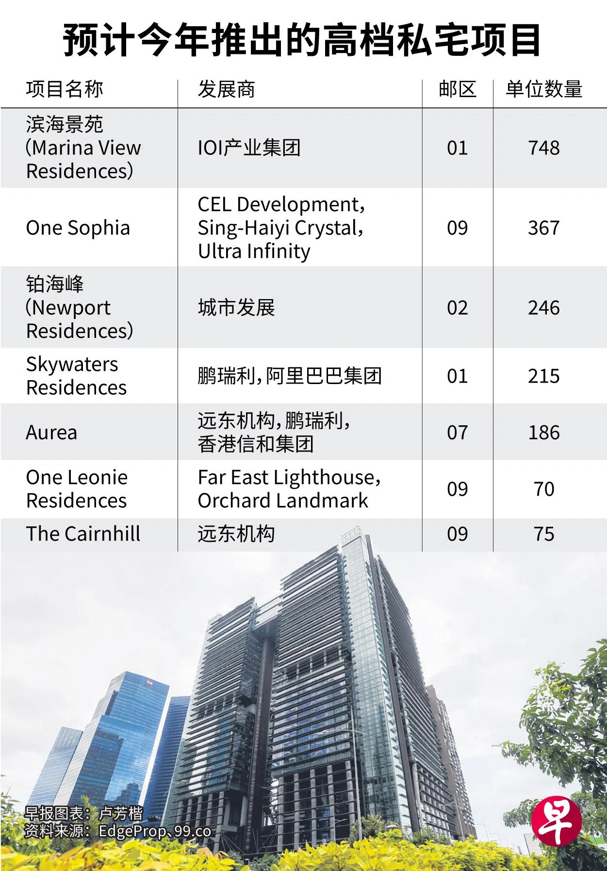 今年核心中央区(CCR)预计将推出多个高档私宅项目,包括滨海景苑(Marina View Residences)、Skywaters Residences、铂海峰(Newport Residences)、One Leonie Residences和One Sophia等。