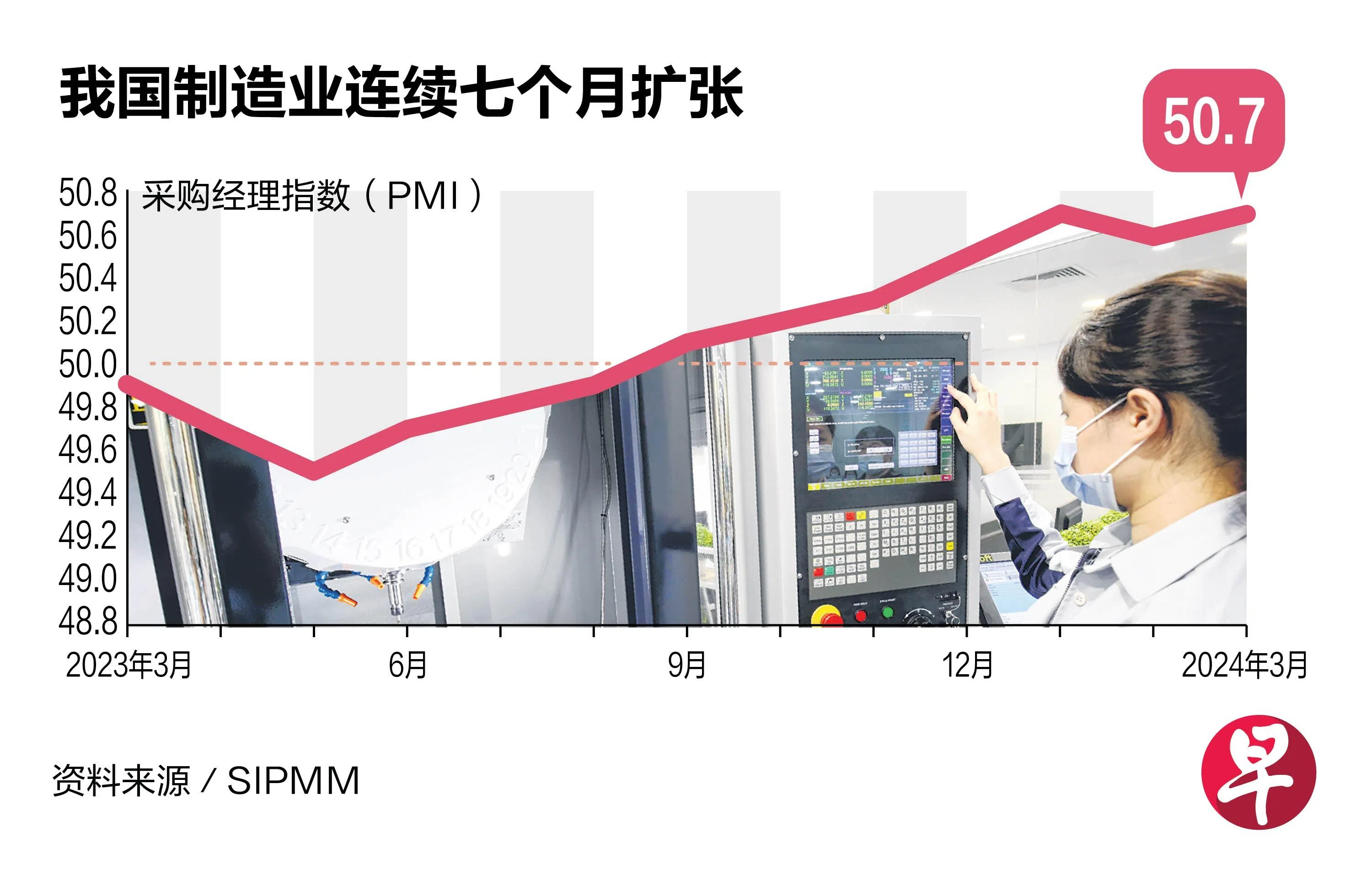 新加坡采购与物流管理学院(SIPMM)星期二(4月2日)发布的最新数据显示,我国3月制造业采购经理指数(PMI)从2月的50.6,上升0.1至50.7。