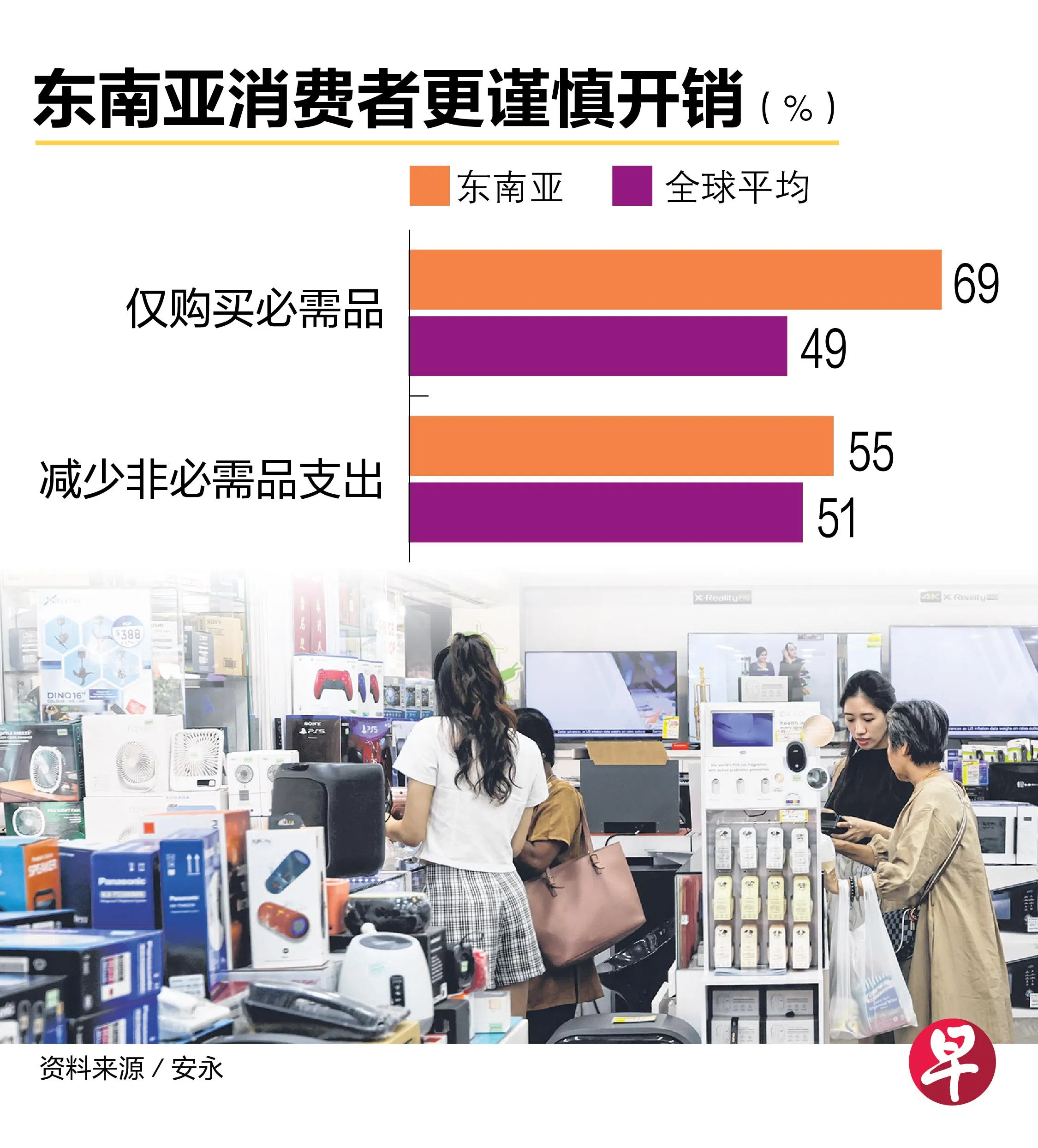 69%的东南亚消费者开始仅购买必需品,高于全球49%的平均水平,55%的人减少非必需品的支出,同样比全球平均水平(51%)要高。