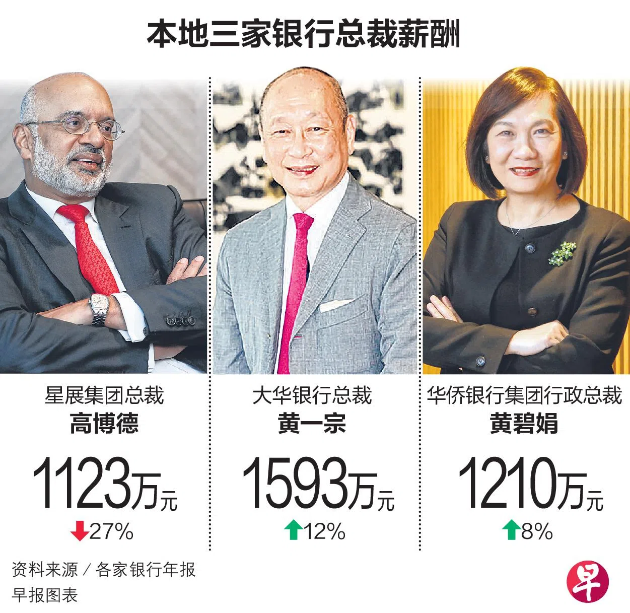 随着华侨发布年报,三家本地银行的总裁薪酬都出炉。其中,大华银行副主席兼总裁黄一宗的薪酬最高,2023年薪酬增12%至1593万元,有望成为2023年薪酬最高的本地挂牌公司总裁。