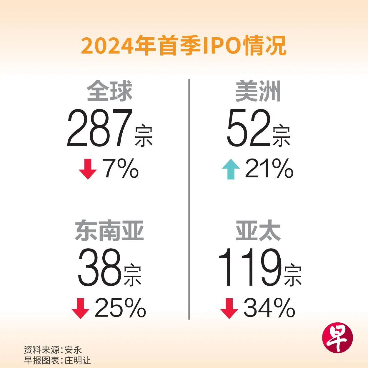 根据安永(EY)星期一(4月8日)发布的2024年首季全球IPO趋势报告,东南亚IPO活动同样冷清,仅有38宗IPO和10亿美元集资额,低于去年同期的51宗和14亿美元集资额。东南亚最活跃的交易所包括印度尼西亚、马来西亚和泰国。新加坡只有一家公司上市,筹集2000万美元。