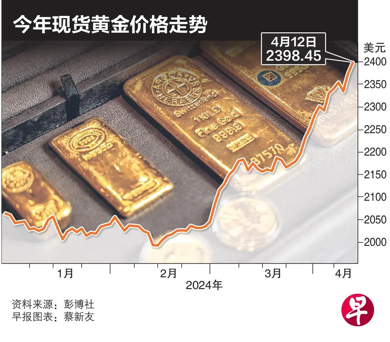 中东紧张局势升温,进一步强化黄金作为避险工具的吸引力,促使现货金价在星期五(4月12日)亚洲时段下午一度攀高至每安士2400美元(约3260新元)的新高。