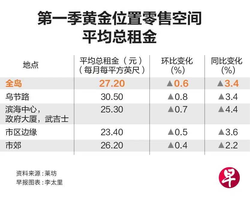 根据莱坊(Knight Frank)星期一(4月15日)发布的第一季零售领域报告,全岛零售平均租金环比增长0.6%,同比增长3.4%,达到每月每平方英尺27.2元。其中,乌节路黄金位置的零售空间租金在第一季取得最大环比增长,涨幅达0.8%。