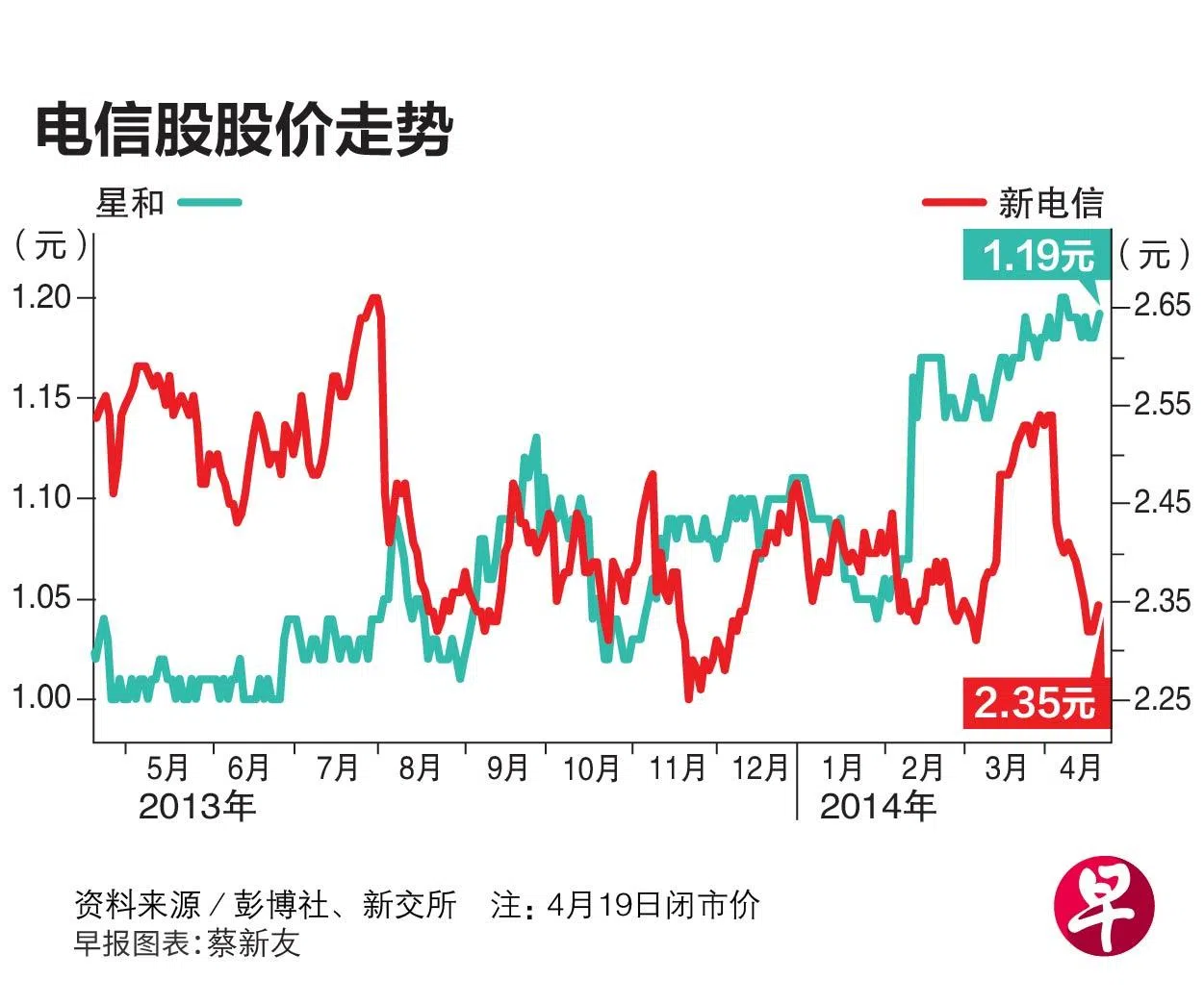 新电信在星期五(4月19日)收报2.35元,起0.43%;星和收报1.19元,无变动。
