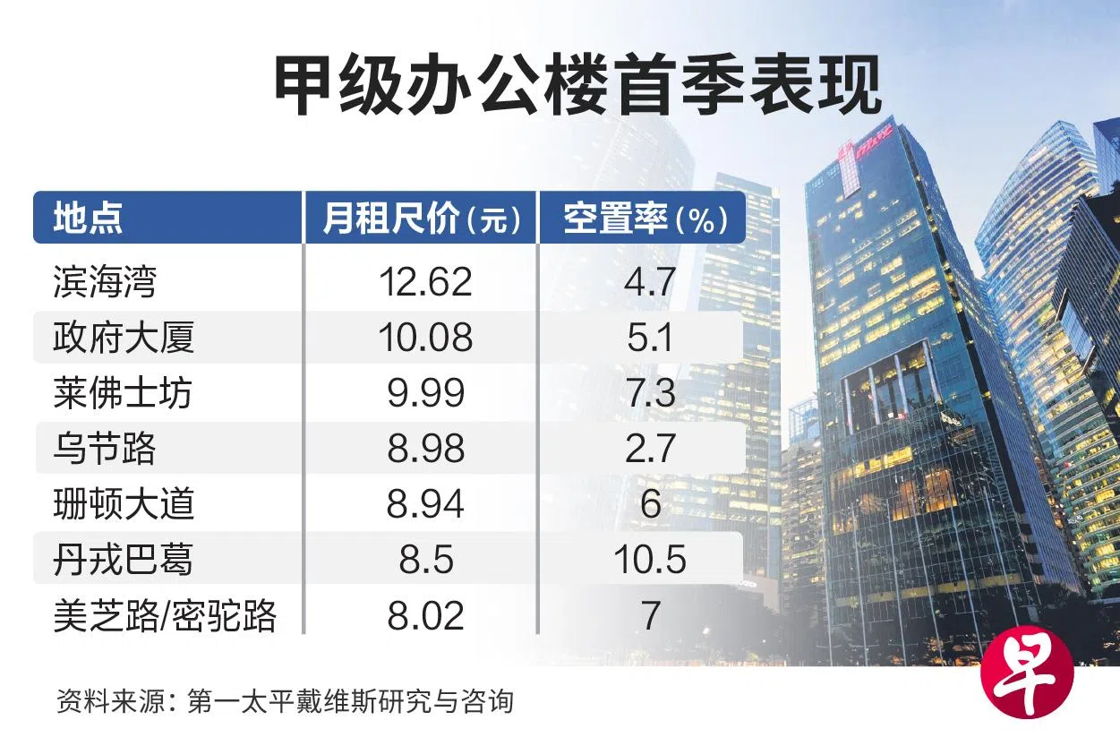 第一太平戴维斯(Savills)星期二(4月23日)发布办公楼报告显示,在甲级办公楼市场中租金最高的滨海湾地段,租金连跌两季,首季环比跌0.2%至每月每尺12.62元,租金第二高的政府大厦地段,首季环比跌0.1%至每月每尺10.08元。