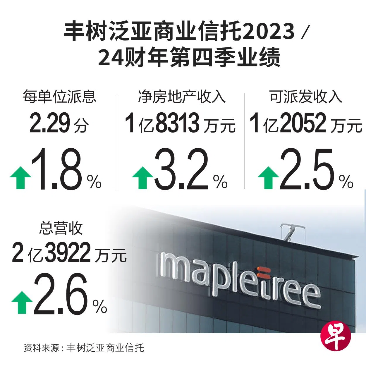 丰树泛亚商业信托第四季每单位派息(DPU)同比增加1.8%至2.29分,派息日为6月6日;可派发收入增加2.5%至1亿2052万元。