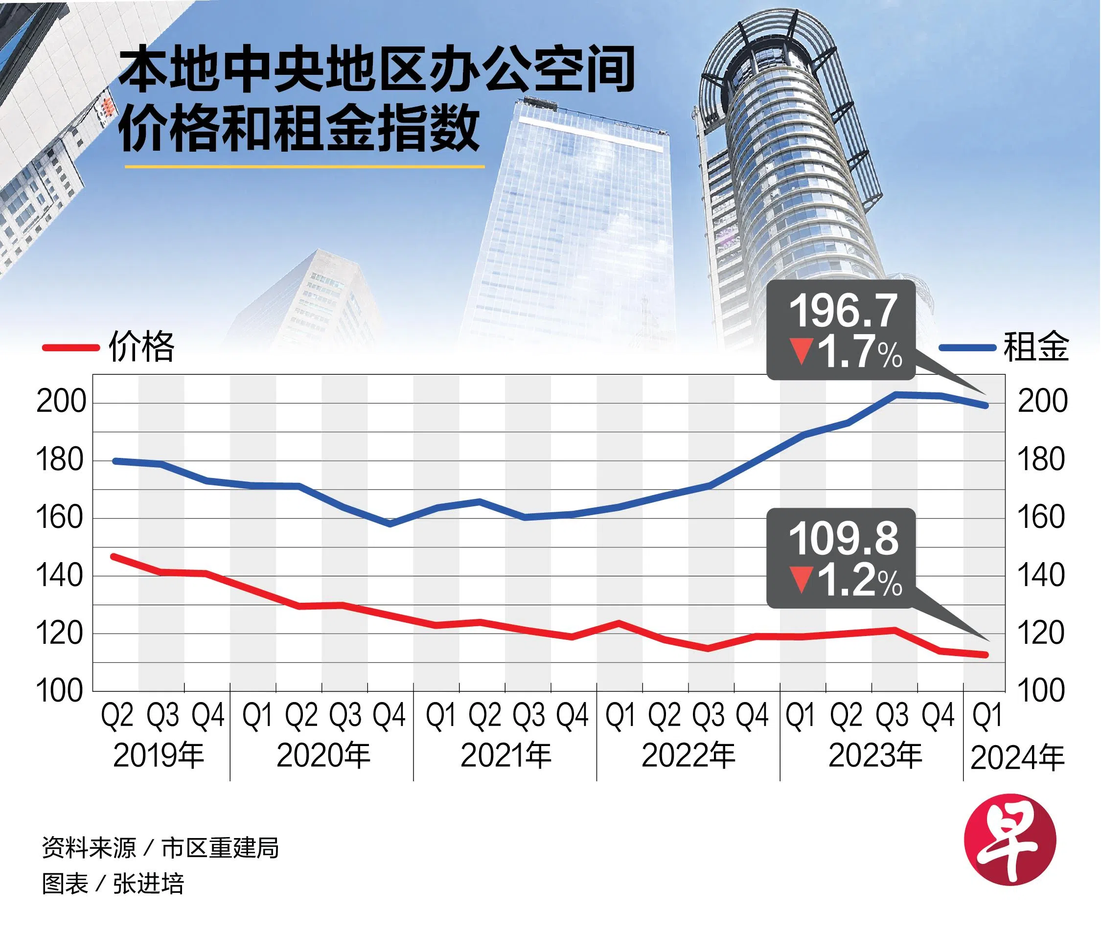 市区重建局在星期五(4月26日)公布的完整房地产数据显示,中央区办公空间租金在连续上涨九个月后,首次在今年第一季下跌。