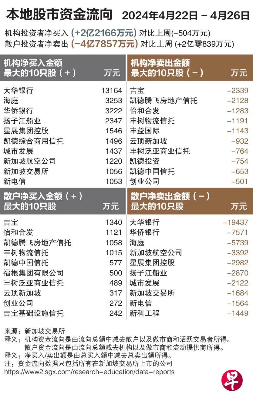 本地股市机构投资者上周净买入2亿2166万元的股票,净买入金额最高的股票为大华银行(UOB),净卖出金额最高的股票为吉宝有限公司(Keppel)。