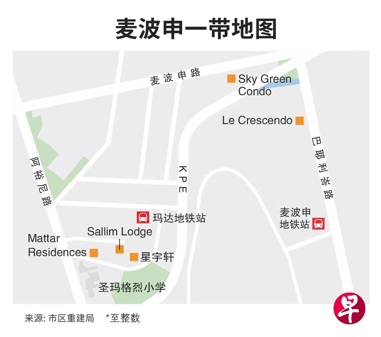 市区重建局今年2月底公布,对麦波申玛达地铁站旁三幅住宅用地的边界和总容积率做出调整,发展高密度住宅。这一带向来是有地住宅的集中地,目前非有地住宅与商店不多。最靠近的学校是圣玛格烈小学。