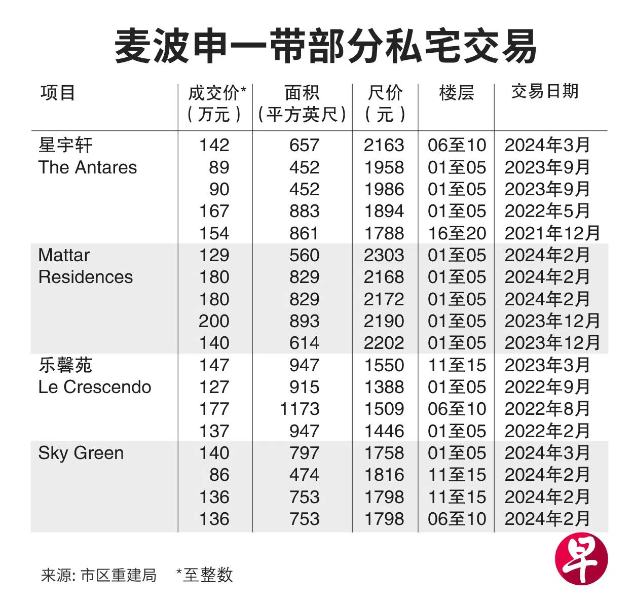 Mattar Residences只有五层楼26个单位。今年2月共有三宗新交易,尺价都在2000元以上。最新出售的单位面积560平方英尺,以129万元出售,尺价2303元。其余两个单位都是829平方英尺,售价180万元。