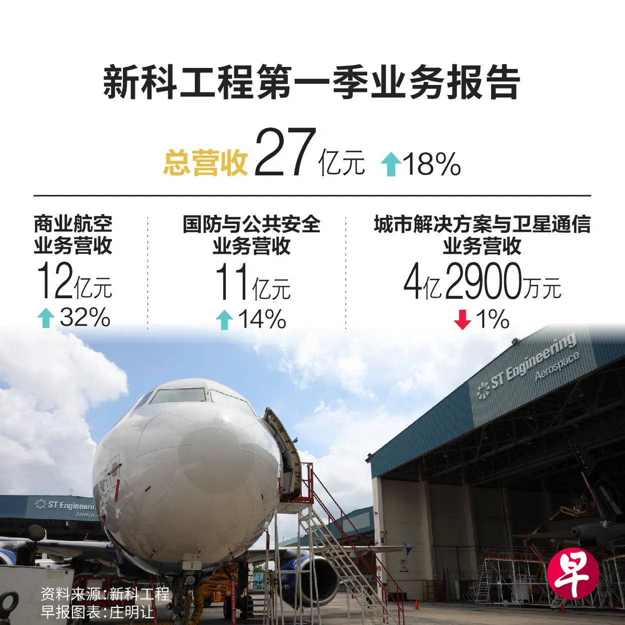 新科工程星期一(5月13日)发布的截至3月底的第一季业务报告显示,商业航空部门营收同比劲增32%至12亿元,主要受益于全面的业务增长以及发动机保养、维修和翻修(MRO)的强劲增长。