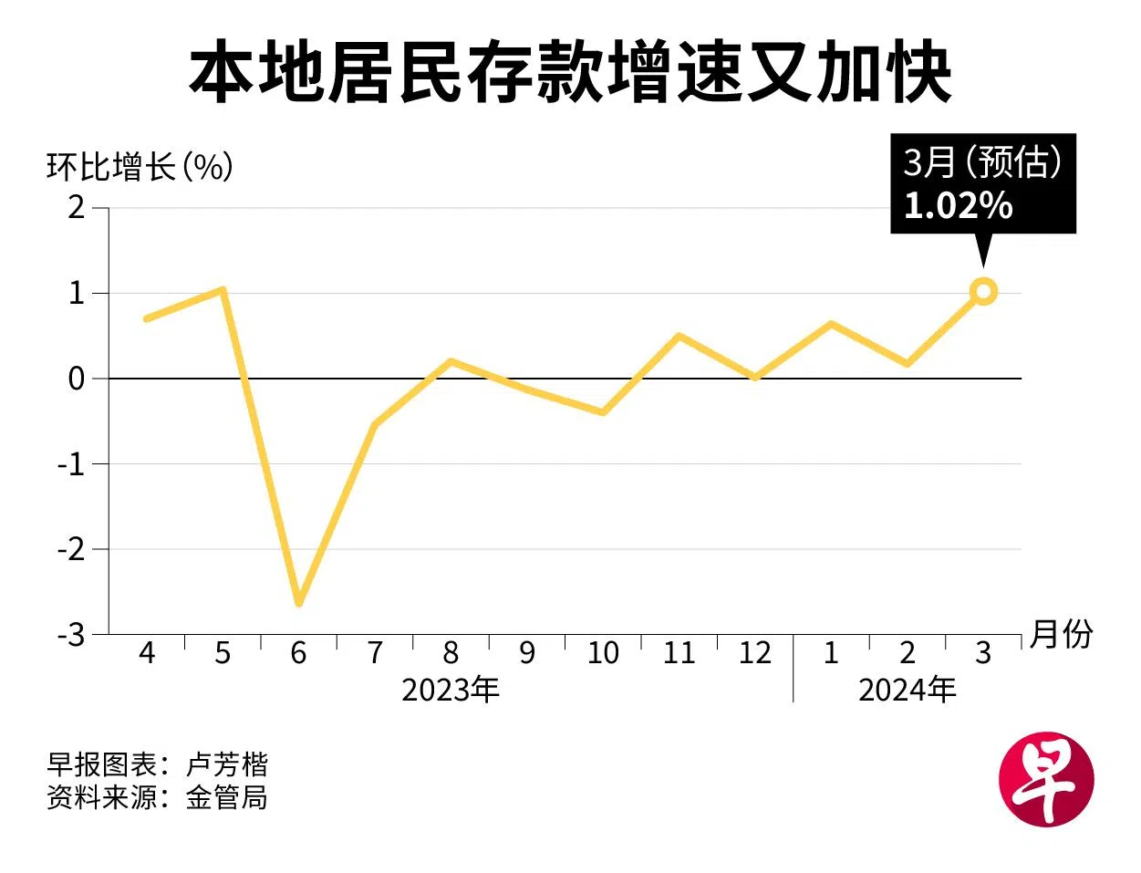 根据新加坡金融管理局每月发布的数据,本地居民存款截至3月底环比增长1%,达9873亿元,是去年6月来的最高水平。这包括个人和非金融机构企业的新元和外币存款。