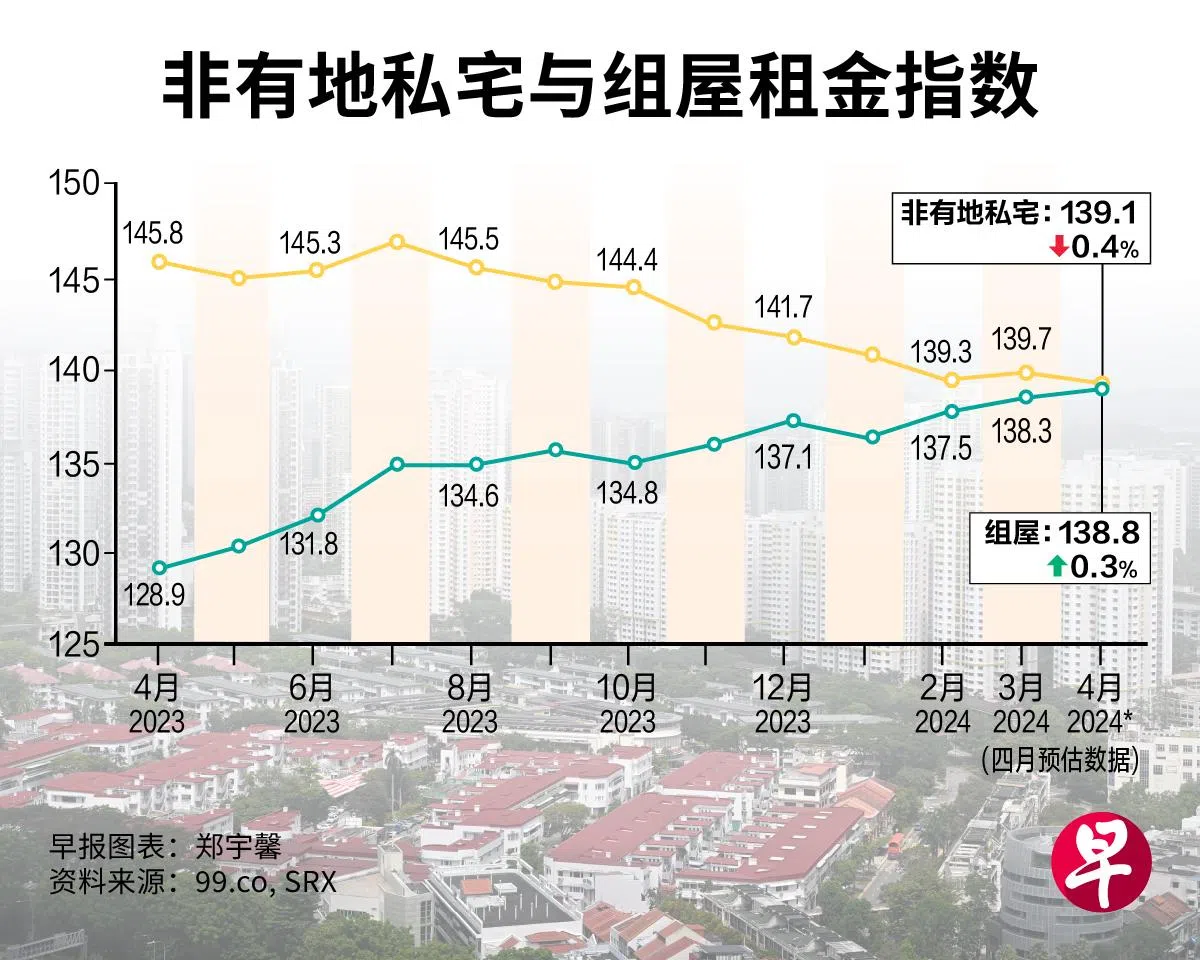 房地产网站99.co和新加坡房地产联合交易网SRX星期五(5月17日)发布的预估数据显示,仅代表高档私宅的核心中央区(CCR)租金环比微涨0.1%,代表中档私宅的其他中央区(RCR)和代表大众化私宅的中央区以外(OCR)私宅租金则分别下跌 0.2%和0.5%。