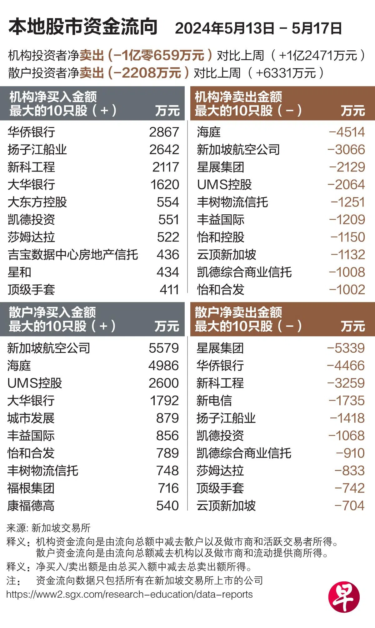 新交所数据显示,本地股市上周有机构投资者净卖出1亿零659万元的股票。净卖出金额最高的股票为海庭(Seatrium),净买入金额最高的为华侨银行(OCBC)。散户投资者净卖出2208万元,净买入最高的为新加坡航空公司(SIA),净卖出最高的为星展集团(DBS)。