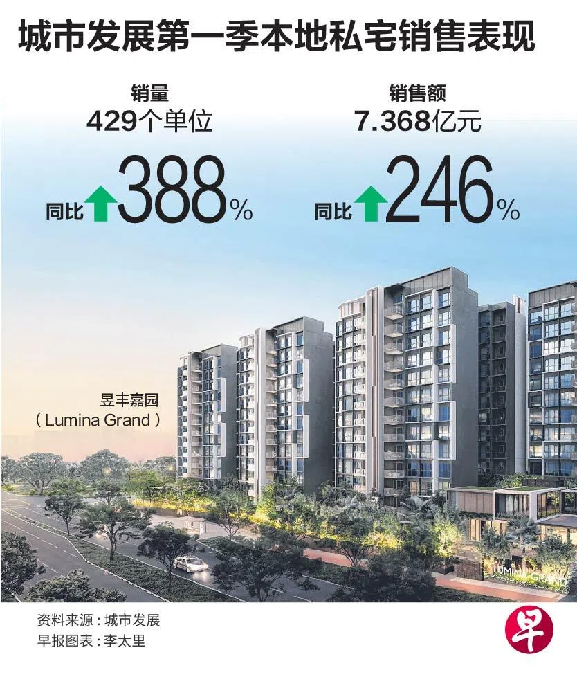 城市发展(CDL)和联营公司今年第一季在本地的私宅銷售额同比增加逾两倍,这主要是因为集团的新项目昱丰嘉园(Lumina Grand)销售成绩亮眼所推动。