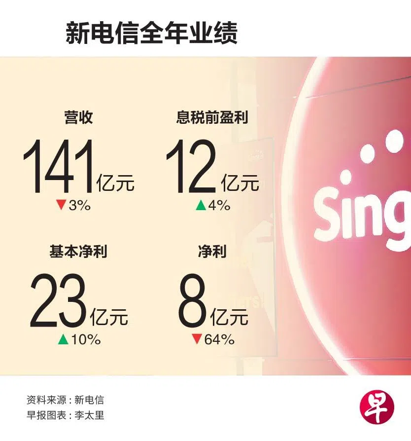 由于特别账项亏损14亿7000万元,新电信(Singtel)集团截至2024年3月底财年全年净利下跌64%至7亿9500万元。