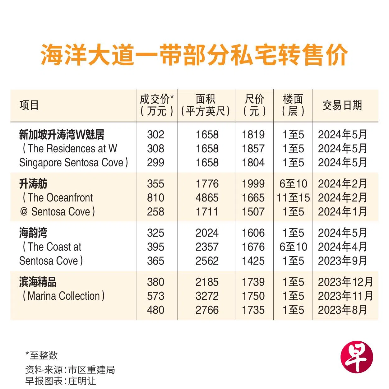 根据市区重建局网站资料,海洋大道一带的新加坡升涛湾W魅居(The Residences at W Singapore Sentosa Cove)、海韵湾(The Coast)、升涛舫(The Oceanfront),以及滨海精品(Marina Collection)去年全年共有19笔交易,但截至今年5月21日,这些项目在不到半年时间里已售出51个公寓单位,交易量增加一倍以上。