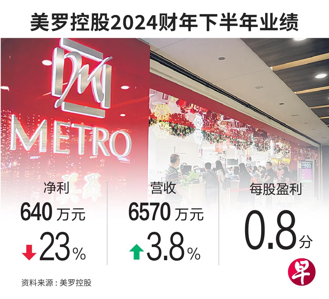 美罗控股(Metro Holdings)在星期五(5月24日)发布的财报显示,公司在截至今年3月底的2024财年下半年中,营收同比增加3.8%至6570万元。每股盈利(EPS)为0.8分,低于去年同期的1分。