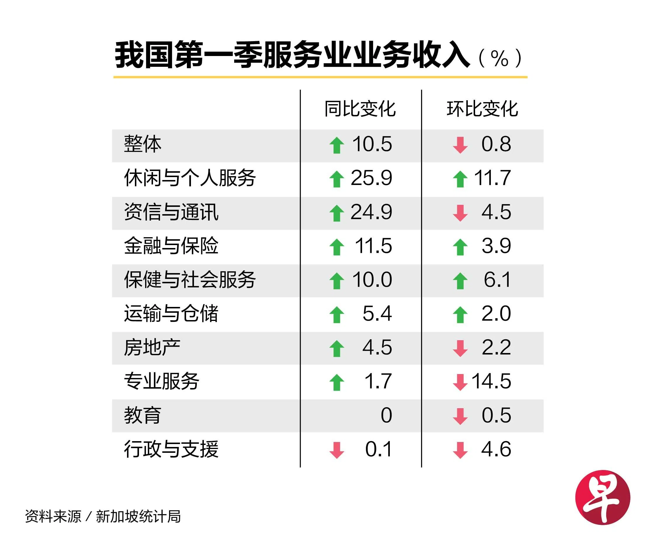 新加坡统计局星期一(5月27日)发布的第一季服务业务收入指数(Business Receipts Index)报告显示, 若不包括批发、零售贸易、住宿与食品服务,整体服务业收入同比增长10.5%,环比则下滑0.8%。