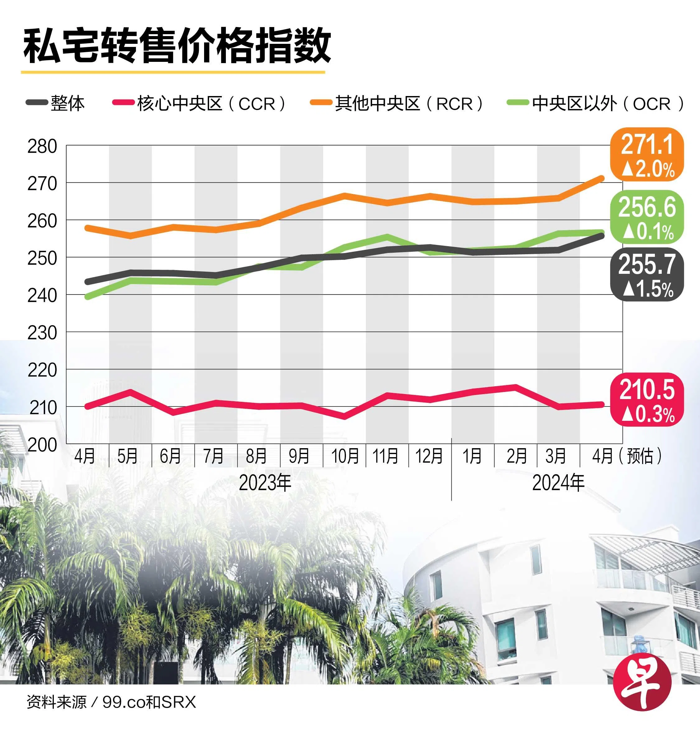 房地产网站99.co和新加坡房地产联合交易网SRX星期一(5月27日)发布的预估数据显示,代表中档私宅的其他中央区(RCR)转售价环比增2%,相比之下,代表高档私宅的核心中央区(CCR)价格增幅为0.3%,而代表大众化私宅的中央区以外(OCR)私宅转售价只上升0.1%。