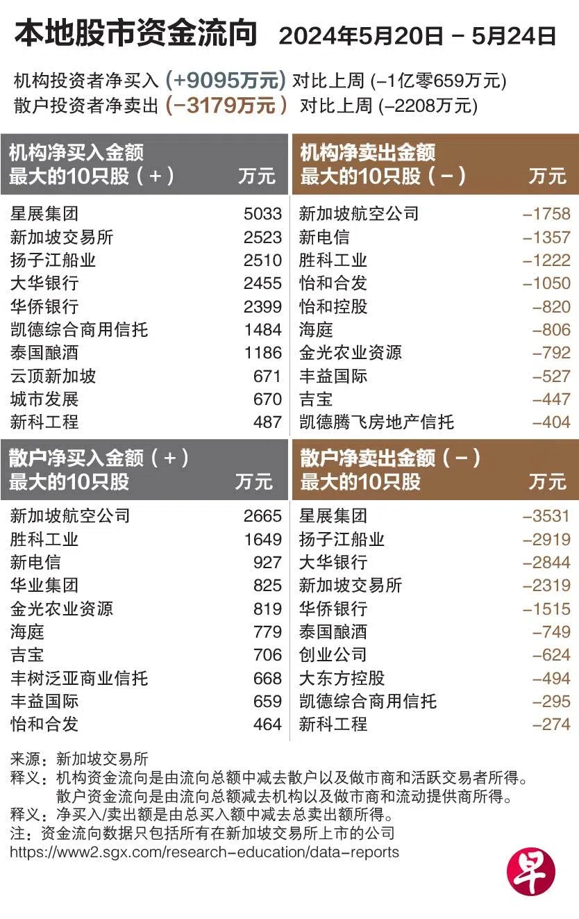 新加坡交易所数据显示,本地股市机构投资者上周净买入9095万元的股票。净买入金额最高的股票为星展集团(DBS),净卖出金额最高的为新加坡航空公司(SIA)。散户投资者净卖出3179万元的股票,净卖出金额最高的股票为星展集团,净买入金额最高的为新加坡航空公司。
