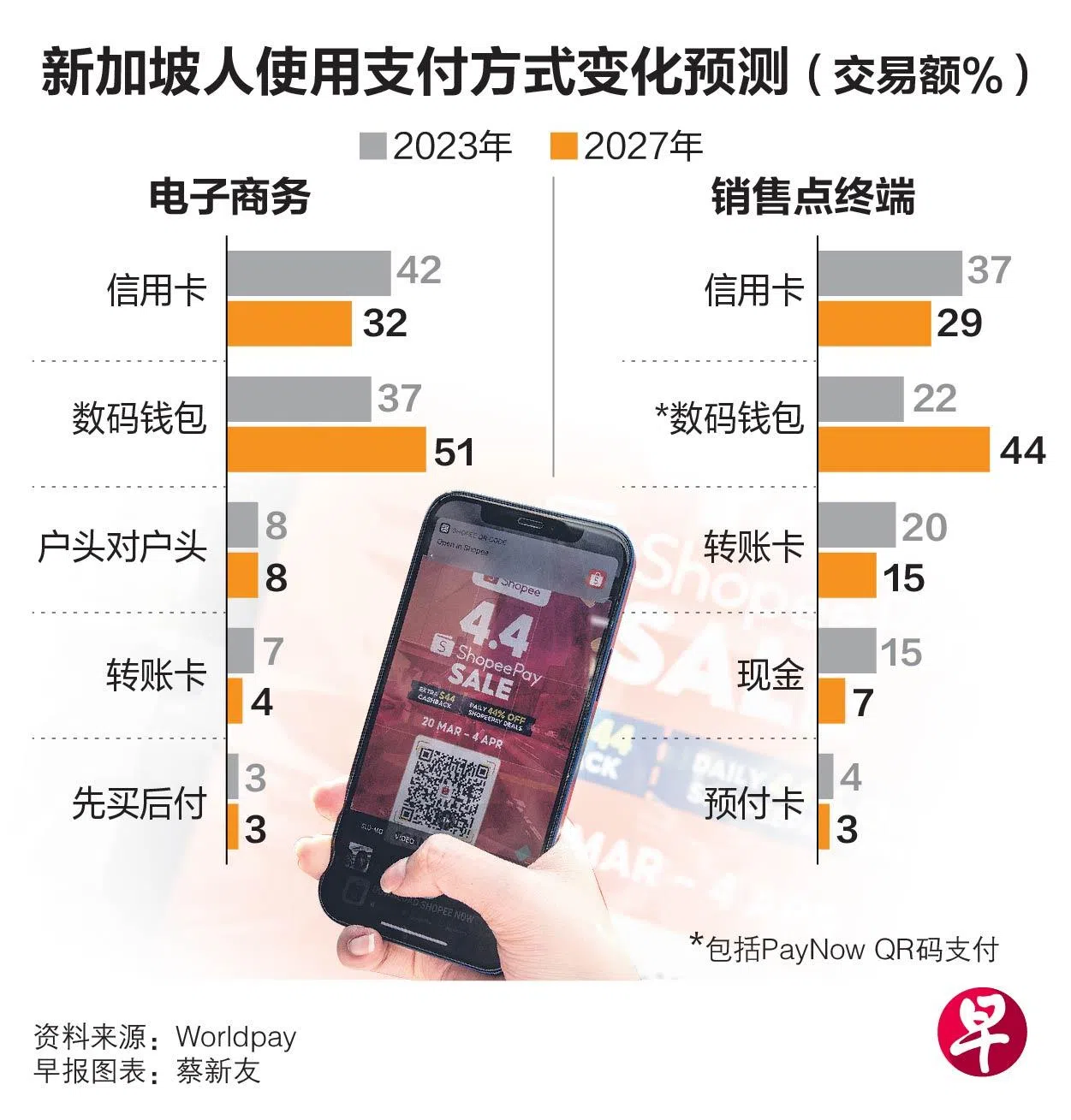全球付款科技公司Worldpay星期四(5月30日)发表的《2024年全球支付报告》披露,去年信用卡仍是我国消费者在电子商务交易和销售点终端的主要付款方式,分别占42%和37%。随着扫码支付的普及,报告预测,到了2027年,在电商交易和销售点终端用数码钱包付款的交易额比率将增加至51%和44%,信用卡的使用率则会分别减少至32%和29%。