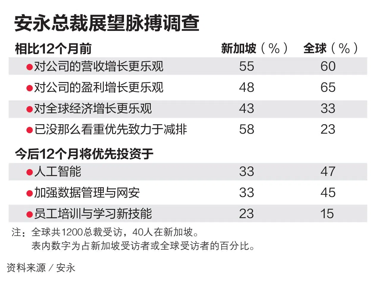 会计事务所安永(EY)星期四(5月30日)发布的总裁展望脉搏(CEO Outlook Pulse)报告显示,55%在新加坡的受访总裁表示,他们对公司的营收增长比12个月前感到更加乐观。这个比率低于全球受访总裁的60%。
