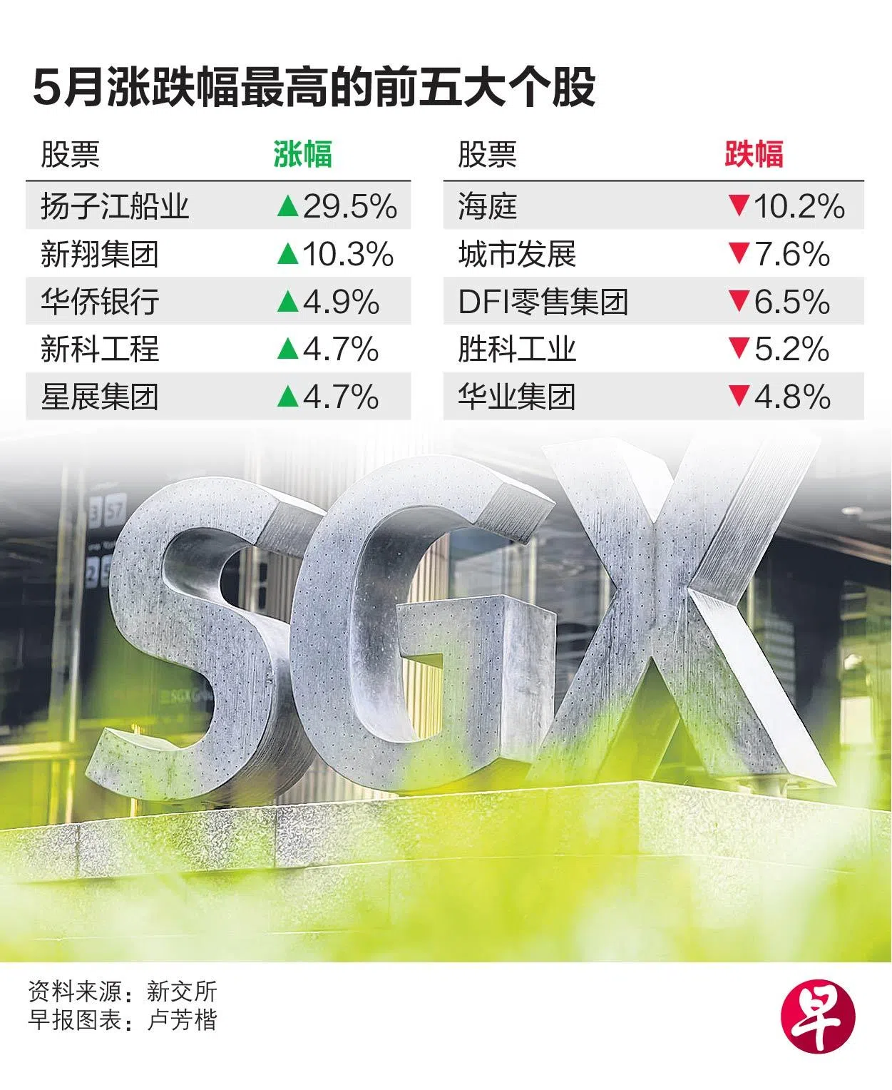从海指成份股个股涨跌来看,扬子江船业(Yangzijiang Shipbuilding)5月涨幅最多,为29.5%。海庭(Seatrium)跌幅最大,为10.2%。
