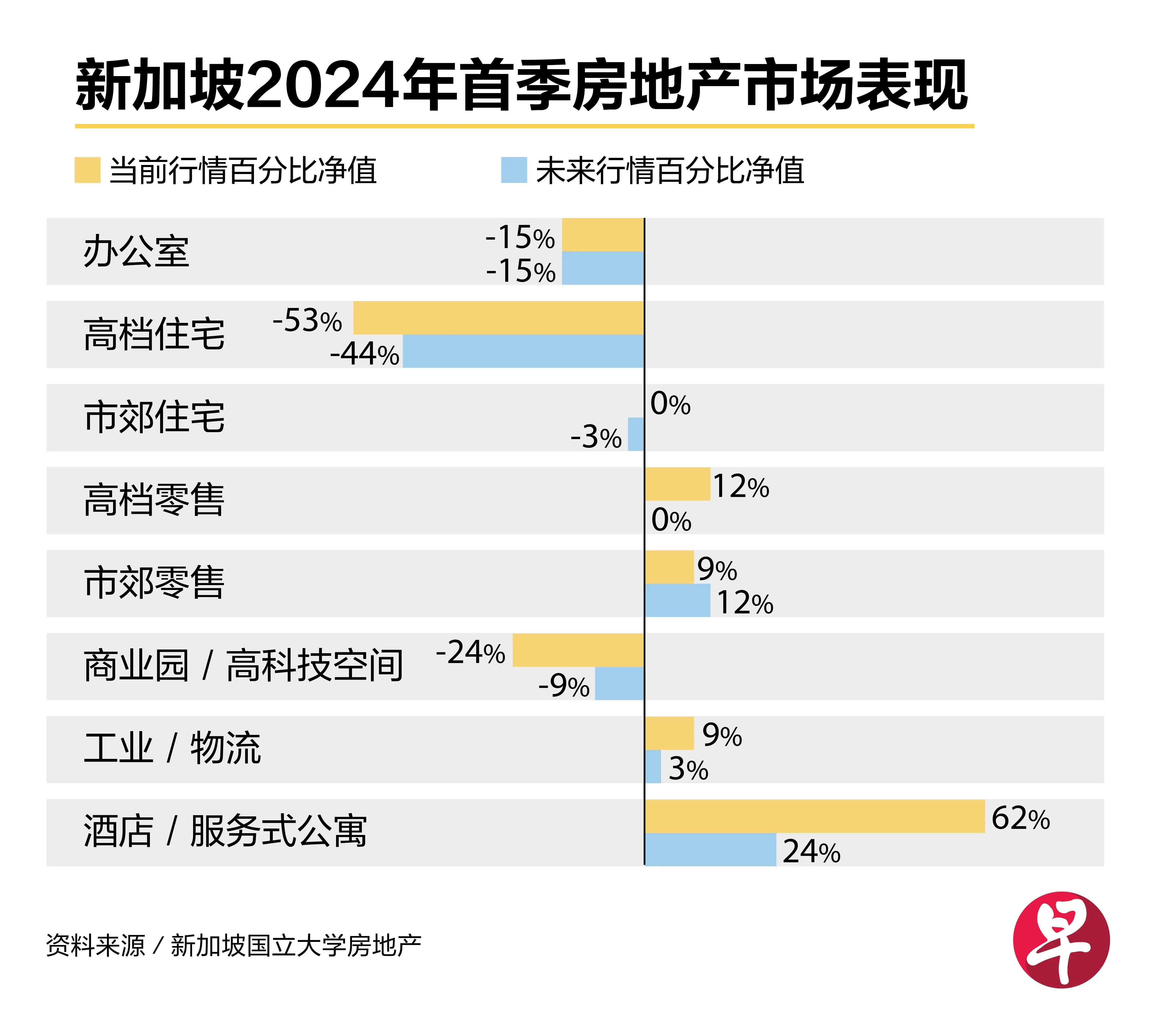 当前行情指数(Current Sentiment Index)基于受访者对过去六个月市场的看法,从上季的4.4上升至4.7,其中,酒店和服务式公寓以62%评分领先,高档住宅则是垫底的负53%。